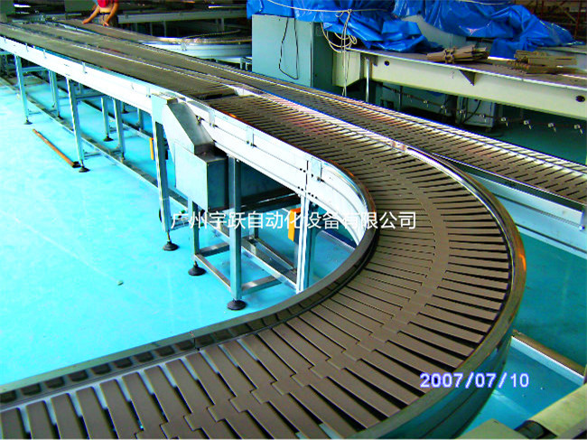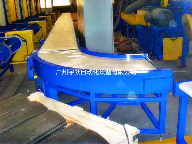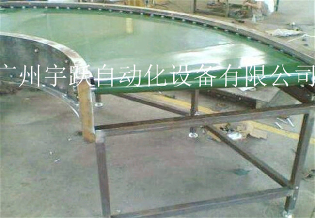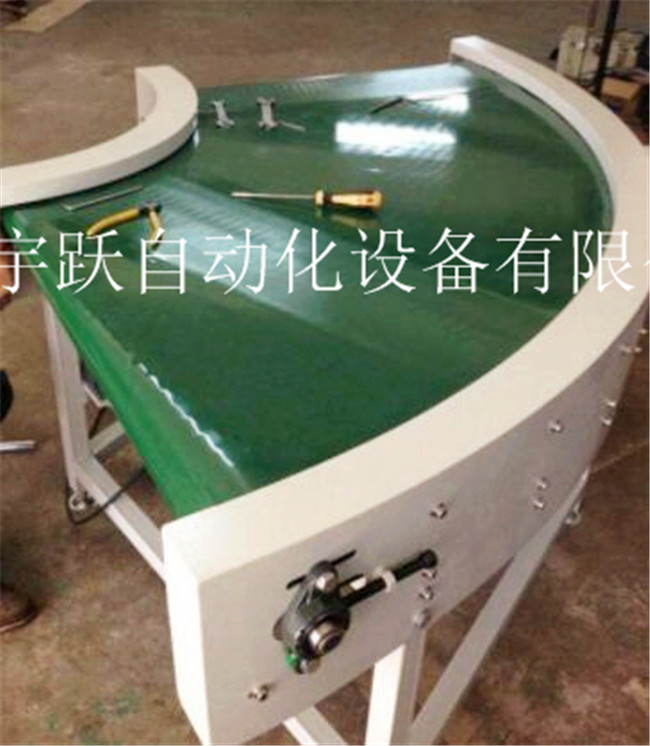 转弯皮带机扇形皮带加装专用的防跑偏滚轮 (轴承外加聚甲醛POM)或者在输送带的外侧高频焊接导向筋使输送带运行在专用的导轨中,辊筒采用专用的锥型包胶辊筒,转弯皮带机可输送的物料种类繁多,既可输送各种散料,也可输送各种纸箱、包装袋等单件重量不大的件货,用途广泛。