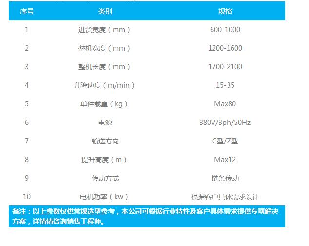 与出入口输送设备配套使用,使输送过程实现自动化,避免了人工操作带来的不稳定性;结构紧凑,占地面积小;安全可靠,易于维护,运行费用低廉,有效降低输送成本;建议单件重量<80kg ,总载荷<1000kg;输送速度<35m;工作节拍≥4s;升降机形式有“Z”型、“C”型、“H”型;装饰安防材料为铝型材+阳光或钢板、铝网等;适用于家电,食品,医药,烟草,涂料化工等行业的成品物流垂直输送。